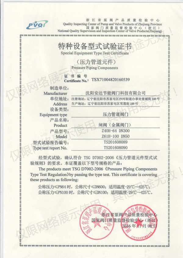 安達閥門特種設備實驗證書